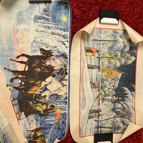 Vanha jouluinen/talvinen seinäpaperi/seinäkoriste. Vuosiluvusta ei tietoa. Taiteilija Jenny Nystörm. Koko n. 40x69cm. Reunoissa paljon nastan jälkiä ja kulumaa. Itse kuva hyvässä kunnossa. Vanhan talon tuoksua hieman kun ollut varastossa. Mielellään vain nouto!