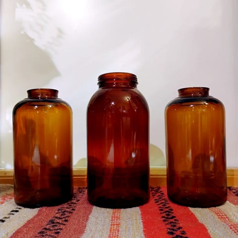Kaksi sinapin keltaista lasipurkkia ja kannet. Toki ovat vanhat mutta mistään eivät ole rikki.