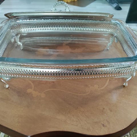 Pyrex lasivuoka tyylikkäällä metallisella irrotettavalla tarjoilukehikolla. Tarjoiluala lasivuoassa 28*18 cm. Saatavana 2 samanlaista. Yhden hinta 20€, 2 kpl 30€, Nouto