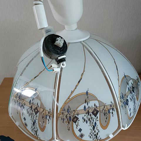 Korkeuden säädin vieterillä. Hempeä kukkakuviotu pinta ja ympärillä lasia. Toimii