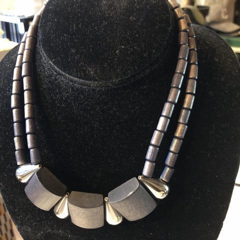 Hyvässä kunnossa kaulakoru,väri hopea ja musta .Roiku musta värisillä nahka "ketjulla".Itse koru noin 6.5 cm.