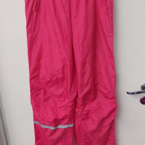 Myydään pinkit ulkohousut, kokoa 170cm, vetoketju taskut, kiristys nyöri vyötäröllä.