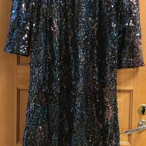 Juhlava musta, pitkähihainen Zizzin paljettimekko, pituudeltaan polvipituinen. Pari vuotta vanha, mutta käyttämätön. Kerran on pesty konepesulla pesupussissa, ei kutistunut kooltaan ja ommellut paljetitkin kesti hyvin kiinni. Mekko on Zizzin XL-koko (eur koko 54), joka tosi reilun kokoinen. Yläosa kietaisumallinen, melko antelias, kaipaisi ehkä pientä huomaamatonta nepparia. Mekko ei ole kovinkaan kevyt, kangas on joustavan oloinen, kokonaan paljetteja ja mekossa on kiinniommeltu ohut alusvuori. Solahtaa helposti päälle ja vyötäröllä kuminauha.