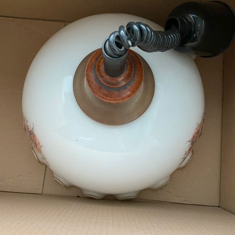 Kattokruunu on hyväkuntoinen. Keskiössä ja nupissa keraamiset koristukset. Hinta:30€. Lähetyskulut lisätään.