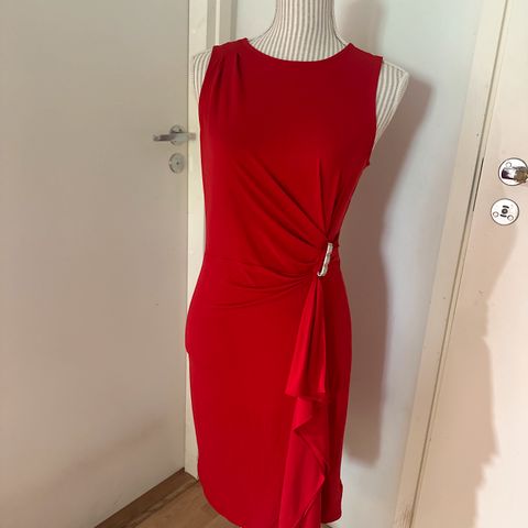 Michael Kors'n hyvännäköinen hihaton vuorillinen juhlamekko, jossa vyötäröllä nahkasomisteet aitoa nahkaa koristevetoketjuin, selän puolella pitkä kiinnitysvetoketju, kai-kai 43 cm, olka-helma 92 cm.