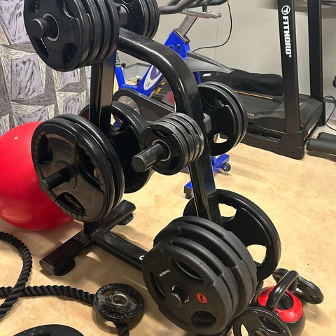Kätevä kolmitasoinen painoteline on näppärä ratkaisu kotisalin säilytysongelmiin. Samassa telineessä on paikat niin levypainoille kuin -tangoillekin sekä ylätaso, johon saa käsipainot. Toimitus sisältää telineen, kuvissa näkyvät painot, tangot ja muut tuotteet myydään erikseen.