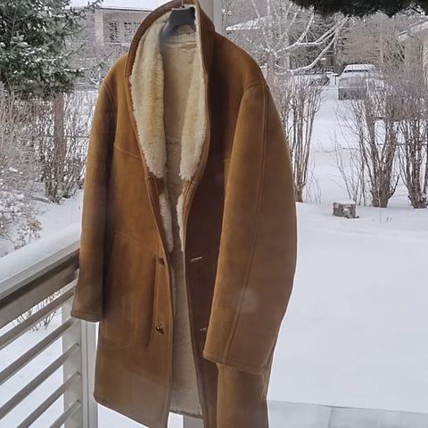 Kuvien mukainen tosi lämmin karvakauluksinen takki. Väri on lähinnä kullanruskea niin kuin ensimmäinen kuva kertoo. Karvaosuus tummempi ruskea.