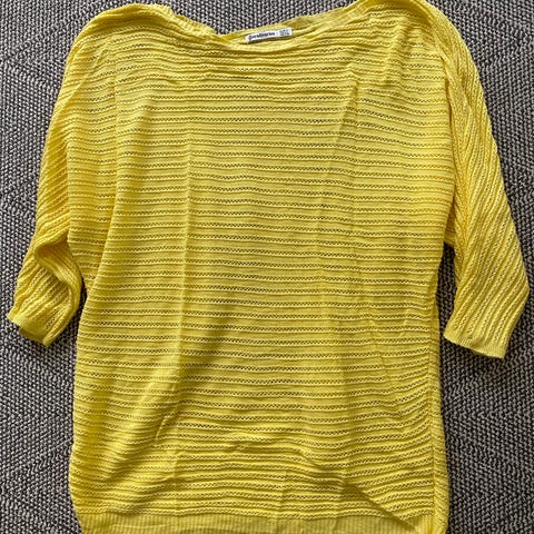 Keltainen käsin virkattu paita koko M-L. Paita myötäilee kauniisti vartaloa. Kaula-aukkoa kiertää solmittava satiininauha. Paita on siisti ja hyväkuntoinen.