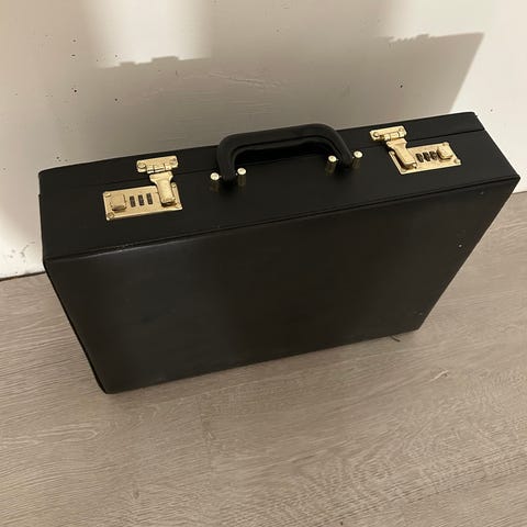 Musta retro salkku 36 x 26 cm, hyvä kunto, kahva, lukko, olkahihnojen pidikkeet