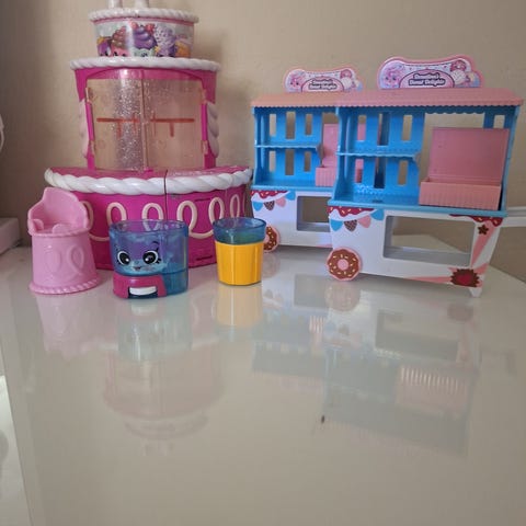 A collection of bunch of Shopkins, including an ice cream truck and a candy shop. All in great condition and one piece!