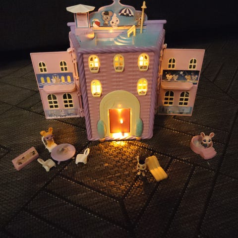 Hiiri-talo, jossa liukumäki, hissi, sänky, WC patterilla toimivalle hiirelle. Patterit vaihdettava hiireen.