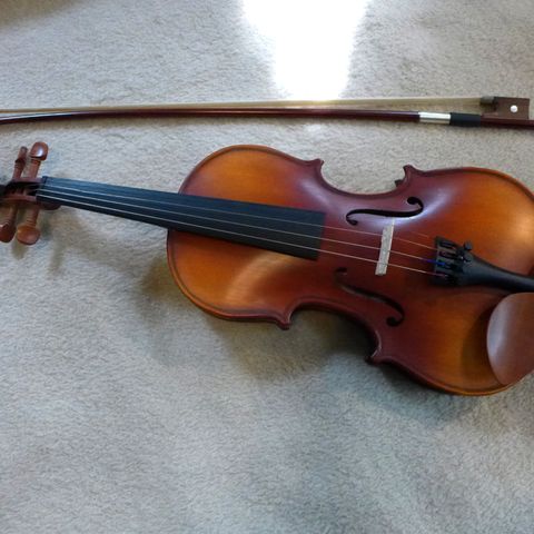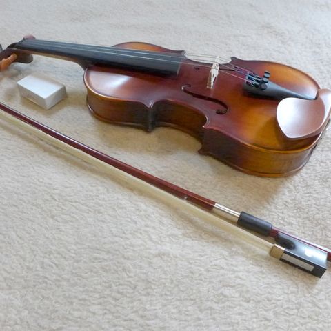 Sarjassa on viulu, kotelo, jousi ja pala hartsia.