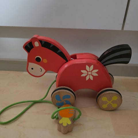 Puinen vetolelu heppa, käytetty, edelleen hyväkuntoinen. Vetonarussa solmu, kts. kuvat. Korkeus n. 16 cm.