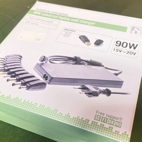 Deltaco 90W kannettavantietokoneen laturi. En muista mihin malliin pää mutta taitaa käydä useaan malliin.