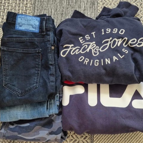 Poikien vaatesetti koossa 150-160cm pääasiassa, jotain edellistä ja seuraavaa kokoa mukana. Sortseja, uikkarit, farkut, Lee housut, paitoja, sukat. Lisätty Adidaksen musta huppari koossa 164cm