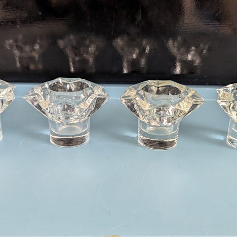 Ethän tingi. Vanhoja tavatoita. Nuutajärven pikari, Arabian leipälautanen, kuparijalkainen kynttilänjalka ja lasinen ilman kuparijalkaa. Kiva lasikannu, noin litran vetoisuus.