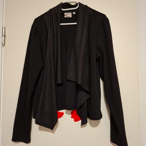 Suomalainen vähän käytetty punainen jakku, koko 42. Edessä ja takana kivat muotoilevat laskokset ja edessä ”valetaskut”. Kunnon napit. Nouto, 10€