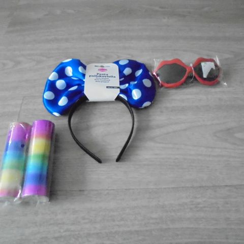 Myydään kuvien mukaiset asusteet polttareihin, vappujuhliin, opiskelijabileisiin, tms.. Queen for a day aurinkolasit, käsiraudat (myyty), punainen sukkanauha, I'm with the bride -rusetti (myyty), poliisilakki -hiuspanta, Nalle -lakin koko noin 58 cm.