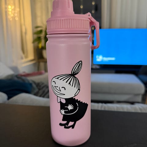 Erinomaisessa kunnossa oleva Muumi juomapullo. Pehmeää silikonia. Korkeus 24cm. Vetoisuus 0,6 litraa.