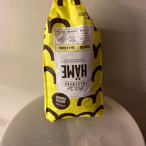 2 muovista lemmikin, esim. kissan, ruoka-astiaa yhteensä eurolla. Pohjan halkaisija 15 cm, syvennyksen halkaisija 12 cm.