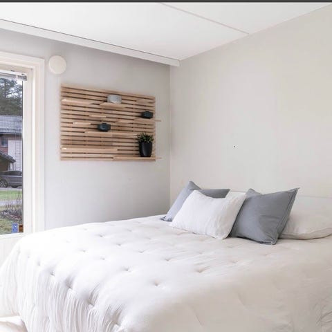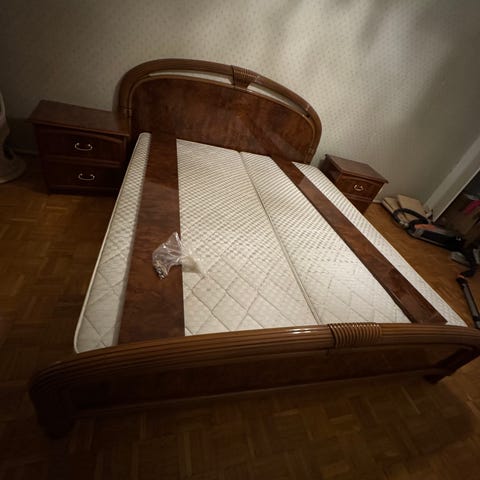 Tekonahka parisänky ja 2 yöpöytää. Patja on 200x180cm,sänky on 6cm leveämpi ja syvempi.Sängynpääty 213x115cm