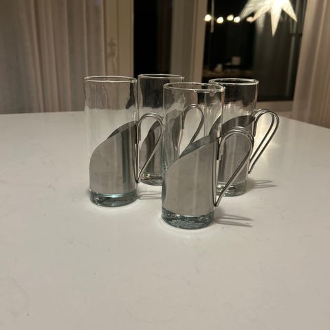4 kpl keraamisia glögimukeja. Uudet. Mukana aluslautaset ja pitkävartiset lusikat