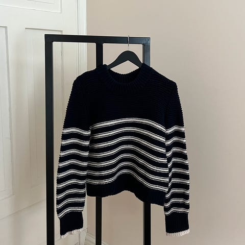 Ruotsalaisen Soft Goatin pehmeä 100% kashmirneule koossa L. Laskeutuva malli. Hihojen saumat asettuvat noin olkavarren tai hauiksen kohdalle.