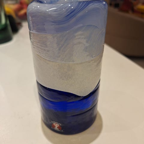 Materiaali lasi, pinnassa paperin alla olki/ruohoaiheinen koriste.