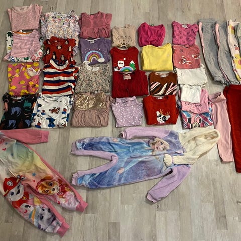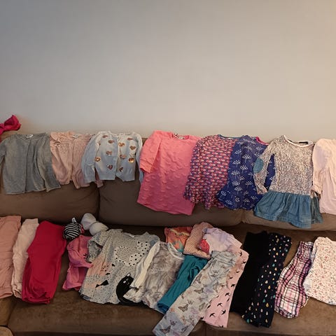 Tarkalla syynillä joissain vaatteissa pientä huomautettavaa, mutta edelleen arkikäyttöön sopivia. Osa vaatteista uutena meille ostettu ja yhden käytössä olleita ja osa tullut käytettynä.