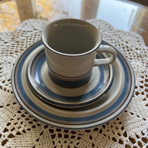 Kuvienmukaiset siistit Arabian Usva astiat .Tee kupit 5kpl mitat korkeus 7cm halkaisija 7,50 cm/Asetit 6 kpl halkaisija 17cm / Kahvikuppien aluslautasia 6kpl halkaisija 14cm .Suunnittelu Anja Jaatinen Winquist 1967. Hinta kaikki yhteensä 30euroa