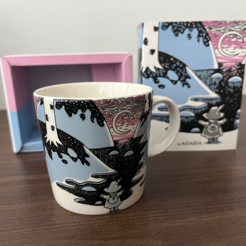 Vuonna 2021 julkistettu Muumin päivä -muki alkuperäisessä pahvipakkauksessa. Käyttämätön ja tarrallinen. Säilytetty pahvipakkauksessa.