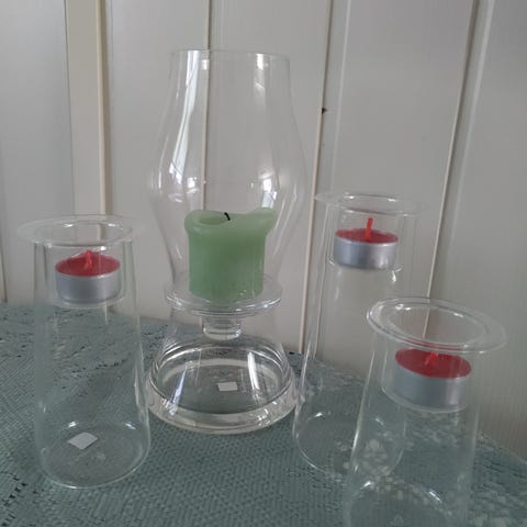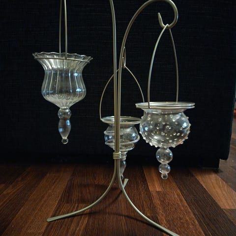 Takorautainen kynttiläsomiste, jossa kolme erillistä lampettia sekä ripustustanko, johon lampetit voi ripustaa eri tavoin.