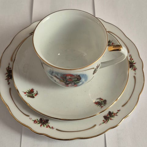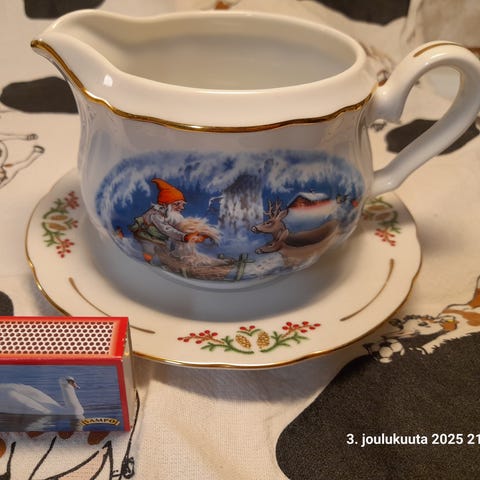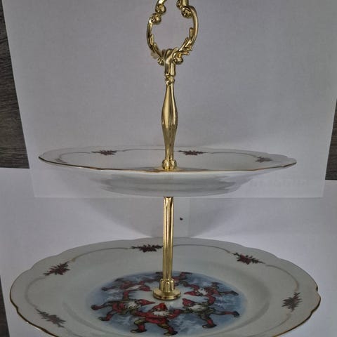 Lars Carlsson Perinnejoulu 2-kerros tarjoiluvati. Lautasten halkaisijat 19,5 ja 24,5cm.