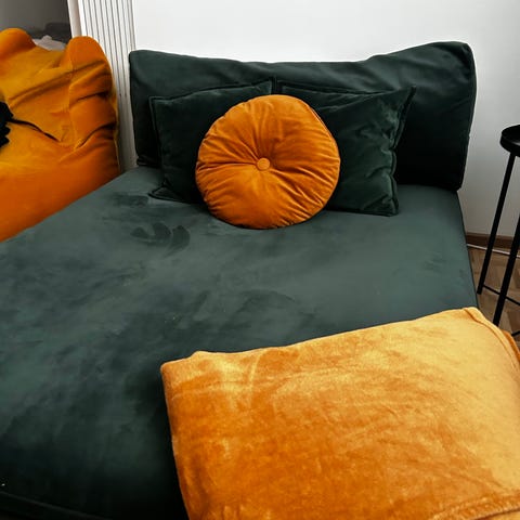 Ostettu uutena muutama vuosi sitten. Pysynyt siistinä ja ollut vähäisellä käytöllä työhuoneessa. Värikkäät sisustustyynyt eivät kuulu kauppaan.