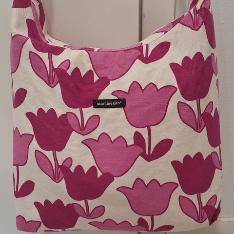 Marimekon olkalaukku. Ollut vähällä käytöllä, joten kankaassa ei juurikaan kulumaa. Sisäpuolella kankaassa värjäymiä, mutta eivät juurikaan näy ulospäin, kuten kuvista voi nähdä.