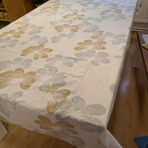 Puhdas ja tahraton kerran käsin pesty käyttämätön mutta silitystä vailla koko 135x250cm, kultakuvio hennosti kimaltaa, hinta 25e🌺