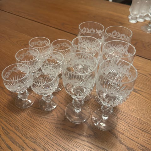 - 6 kpl valkoviinilasi. Korkeus 18 cm, leveys suuaukon kohdalta n. 6 cm.