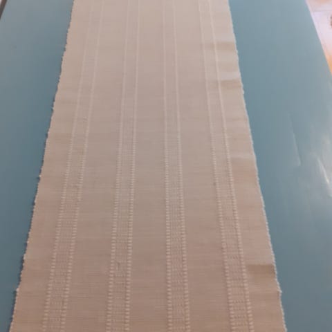Kaitaliina koko 34 x 140 cm. Liinassa pieni tahra tai kuluma liinan toisessa päässä n. 30cm toisen pään reunasta (kuva 2)