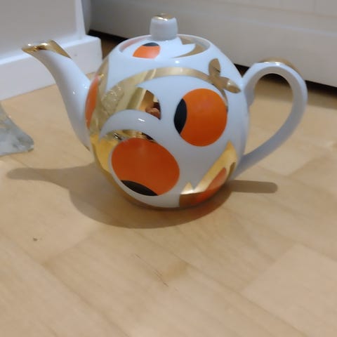 Koristekäytössä ollut venäläinen teekannu. Tummansininen kultauksilla, ehjä. Korkeus n.14 cm.