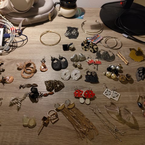 Muodikkaita rihkama korvakoruja 6kpl pussissa. Kaikki korvakorut ovat läpi korvan ja sisältävät lukot. Kaikki korut ovat rihkamaa. Ei postitusta ja maksu vain käteisellä.