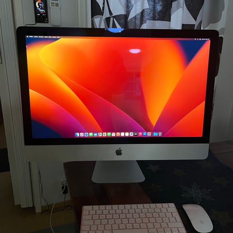 Hyväkuntoinen käytetty iMac 27. Päivitetty fusion drive versiosta ssd levy malliksi. Alkuperäispakkaus, näppäimistö ja hiiri sisältyy konepakettiin.