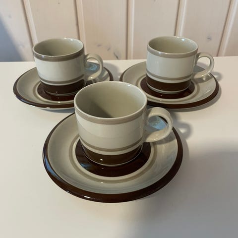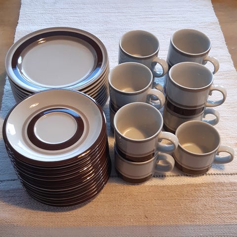 Arabia seitsemän kahvikuppia kloja vähän enemmän kupin tansseja, eli aluslautasia. Yhdessä kupissa pieni särö.