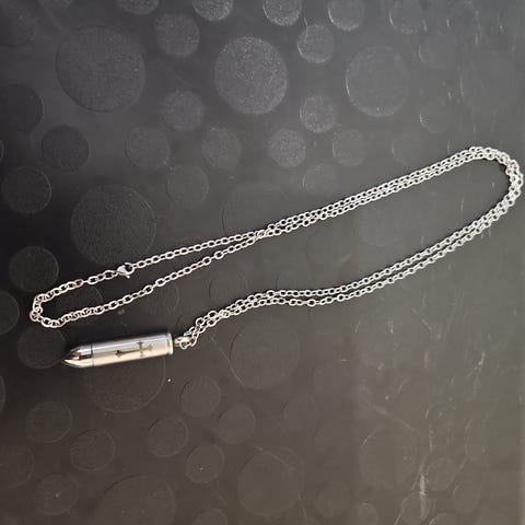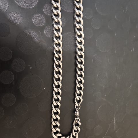 Hopeanvärinen kaulaketju, jossa riipus. Ketjun pituus: 74cm. Riipuksen halkaisija: 4cm. Riipus kimaltelee kauniisti. (Nouto tai postituskulut 5,50;- lisätään hintaan).