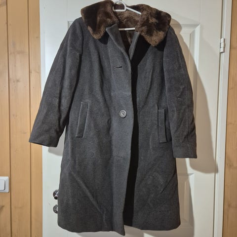 Tummansininen, A-linjainen villakangastakki. Kotimaisen Femitex Oy:n valmistama. Takissa on vuori, pintamateriaali puhdasta uutta villaa jopa 80%.