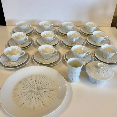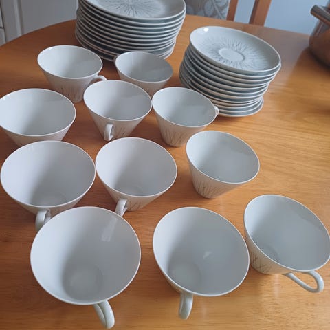 Arabian Stella kahviastiasto. Ohutta posliinia. Nouto. Kahvikuppeja 5kpl. Asetteja 6kpl. Pulla lautasia 8kpl. Kermakko ja sokerikko. Lohkeamia näistä 1kpl asetissa ja 2kpl pullalautasissa. Muutenkin kulumaa reunoissa voi olla.