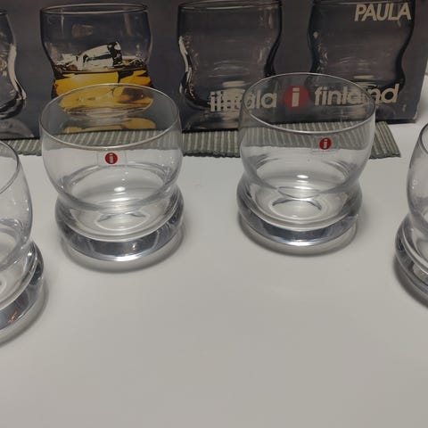 Iittalan Jorma Vennolan Paula-sarjan kermakko kork 7 cm ja kaksi lasia kork 8,5 cm. Aivan hentoja käytön jälkiä jokaisessa. Yhdessä lasissa valmistuksesta alkaen ollut pieni reunan paksuuntuma.
