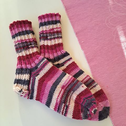 Myydään kuvan villasukat. Uudet. Pitkä varsi. Kotimainen lanka. Värit harmaa, vaaleanpunainen ja valkoinen