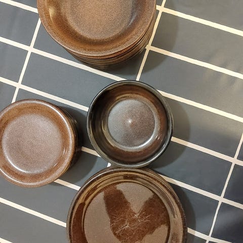 6kpl 13,5cm halkaisijalla olevaa lautasta ja 4kpl 11,5cm halkaisijalla olevaa lautasta. Yhteensä 10e. Kermansavi.
