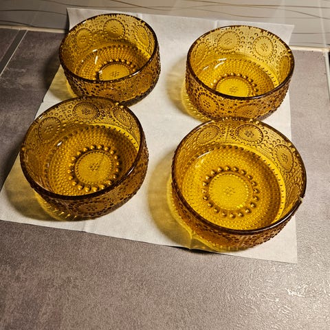 Vähällä käytöllä olleet Grapponia lasiastiat. Huom. yhdessä jälkiruokakulhossa lasilohkeama, kuvassa.