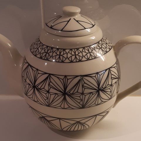 Mokkamaa-kahvikaupasta ostettu luonnonvalkoinen teekannu. Kannesta lohjennut kaksi pientä palaa, näkyy kuvissa. Muuten ehjä.